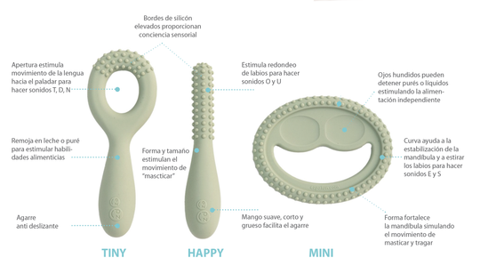 • Cada herramienta ayuda a fomentar diferentes sonidos del habla: Tiny (t, d, n), Mini (e, s, z), Happy (oh, oo, w).
