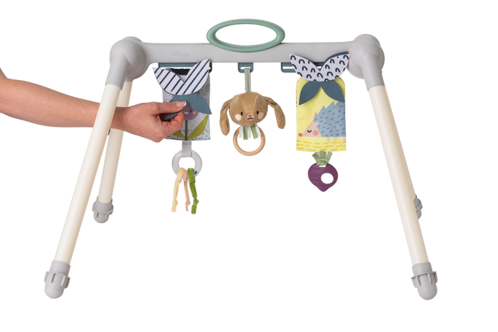 • Gimnasio portátil para bebés: las piernas se pliegan cuando no se usan para facilitar el almacenamiento y la portabilidad.