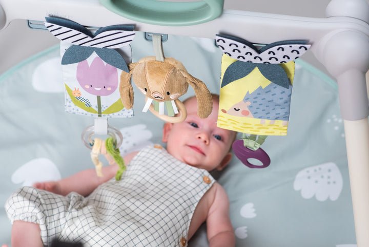 • Jugar con los juguetes colgantes fomenta el desarrollo de los sentidos del bebé, las habilidades motoras finas y gruesas y la coordinación ojo-mano.