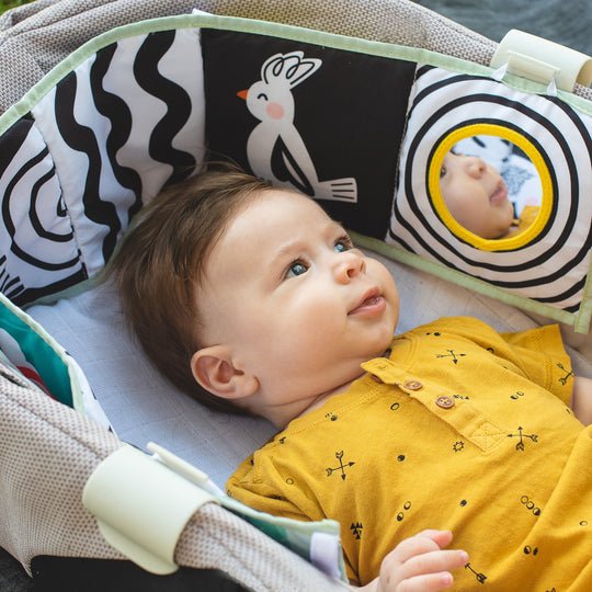 - Incluye un espejo seguro para bebés, formas arrugadas, telas con textura, un mordedor y un bolsillo que lo mantendrá ocupado jugando y disfrutando.